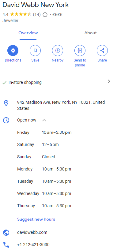 Brands should audit and manage their business citations regularly to ensure that NAP information is consistent across all platforms. Consider seeking mentions on authoritative and relevant industry websites to further strengthen local SEO. Note how David Webb, for example, have the same store opening hours, address, and phone number for their New York boutique on both their GMB page and their website.