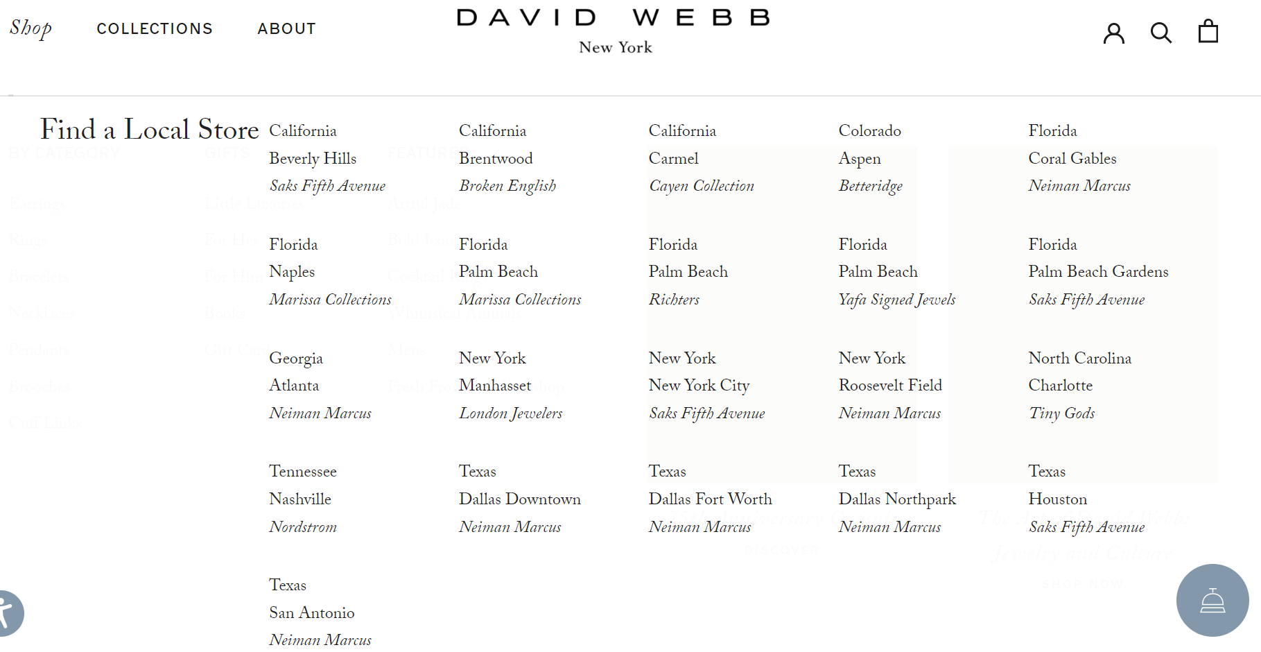 To continue with our David Webb example, they have an optimized boutique page on their website which allows customers to not only find their three flagship stores, but every store across the country that sells their jewelry, including Saks Fifth Avenue stores in California, Florida, and Houston, as well Neiman Marcus in Texas, and Betteridge in Colorado, among many others.