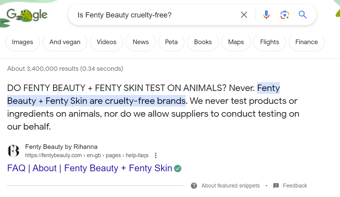 For example, some of the top questions that searchers ask about Fenty include ‘Is Fenty Beauty cruelty-free?’ and ‘Who owns Fenty Beauty?’.* So, rather than leaving these users in the dark or letting them stumble across other celebrity-owned cruelty-free brands, they drew up an FAQ page that appears at the top of SERPs to answer these questions quickly and conveniently.