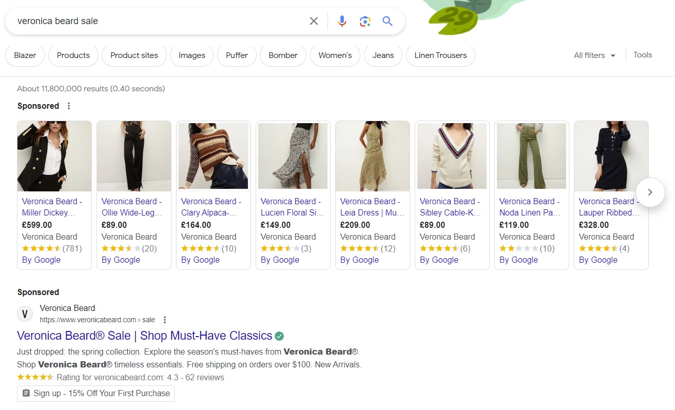 This is particularly helpful when consumers search for a brand name followed by, for example, ‘sale’. In this case, luxury brands may end up competing with their various sales channels, like luxury marketplaces. For instance, when searching ‘veronica beard sale’ the organic results display sales from Veronica Beard, as well as the Outnet, Trilogy Stores, Zalando, and more. But through targeting paid advertising — with both Google Shopping Ads and Google Search Ads — Veronica Beard can secure the top spot on the SERP, which takes customers to their sales page.